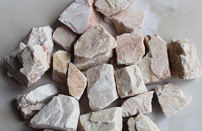 钠长石大块物料经破碎机破碎到能进入磨粉机的入料细度(15mm-50mm)。