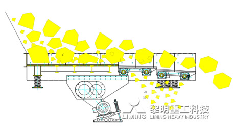 TSW给料机惯性式双偏心轴激振器能产生定向激振力。两轴之间有一对传动比为1的齿轮副连接,保障其回转方向相反,转速相等。通过电动机驱动,两偏心轴旋转,由于两轴上的偏心质量和偏心距大小相等,所产生的惯性力在一个方向互相抵消,而在另一个方向互相叠加,从而合成的定向激振力,使与此激振器刚性连接的给料槽体在支承弹簧上做强制振动,物料在振动力的作用下,在料槽上作滑动及抛掷运动,从而使物料前移而达到给料目的。当物料通过槽体上的蓖条时,较小的物料通过蓖条之间的间隙落下直接进入下道破碎工序,从而起到预筛分效果,保障破碎设备的破碎效率及能力。
