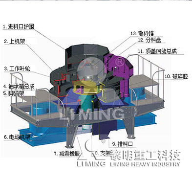 中心进料伴随环形瀑落进料:物料落入制沙机进料斗,在经环形孔落下,被分料板分成两股料,一股经分料盘进入高速旋转的甩轮,另一股从分料盘四周落下。进入甩轮的物料,在甩轮内被迅速加速,其加速度可达数十倍重力加速度,然后高速从甩轮内抛出,首先同由分料器四周自由落体的另一部分物料冲击破碎,然后一起冲击到涡流腔内涡流衬层上,被物料衬层反弹,斜向上冲击到涡流腔的顶部,又改变其运动方向,偏转向下运动,又与从叶轮流道发射出来的物料撞击形成连续的物料幕。这样,一块物料在涡流破碎腔内受到两次至多次几率撞击、摩擦和研磨破碎作用,被破碎的物料由下部排料口排出。