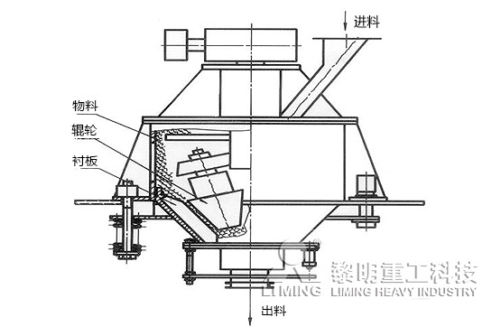直通式离心磨采用中速中压、连续反复料床层压粉磨原理,物料上进下出,粉磨和分级分别进行。该机上部传动,带动主轴旋转,使辊轮在环锥形内衬中转动(辊、衬之间间隙可调,不接触),物料从上部给入,靠自重下落。由于上部推料和下部堵料相互作用,物料在辊轮与衬板之间形成料层,料层受到辊轮的反复滚动碾压而成粉末,最后从磨机的下部自动卸料。
