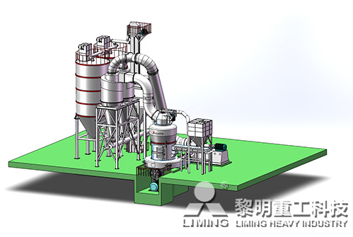 破碎后合格的物料,经变频皮带给料机均匀定量连续地送入主机磨室内进行研磨。粉磨后的物料被风机气流送入选粉机进行分级,在分析机的作用下,不符合细度要求的物料落入磨室内重新碾磨,合格的物料则随气流经管道进入旋风集粉器内,进行分离收集,经排料装置排出即为成品粉体。分离后的气流通过旋风集粉器上端回风管进入风机。该系统在负压状态下运行,设备配有脉冲除尘器,符合国家环保标准。