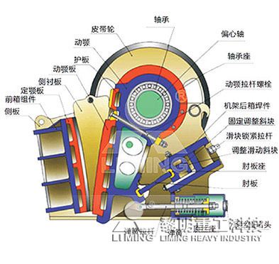 欧版颚式破碎机主要由机架部分,偏心轴转动部分,破碎腔工作部分,保险装置,排料口调整装置等组成。