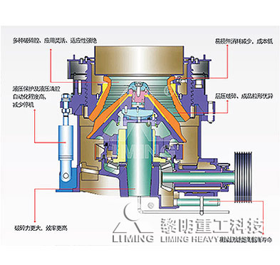 用固定主轴、小球面轴互等的优化结构,比弹簧圆锥破的效率高5%-15%。